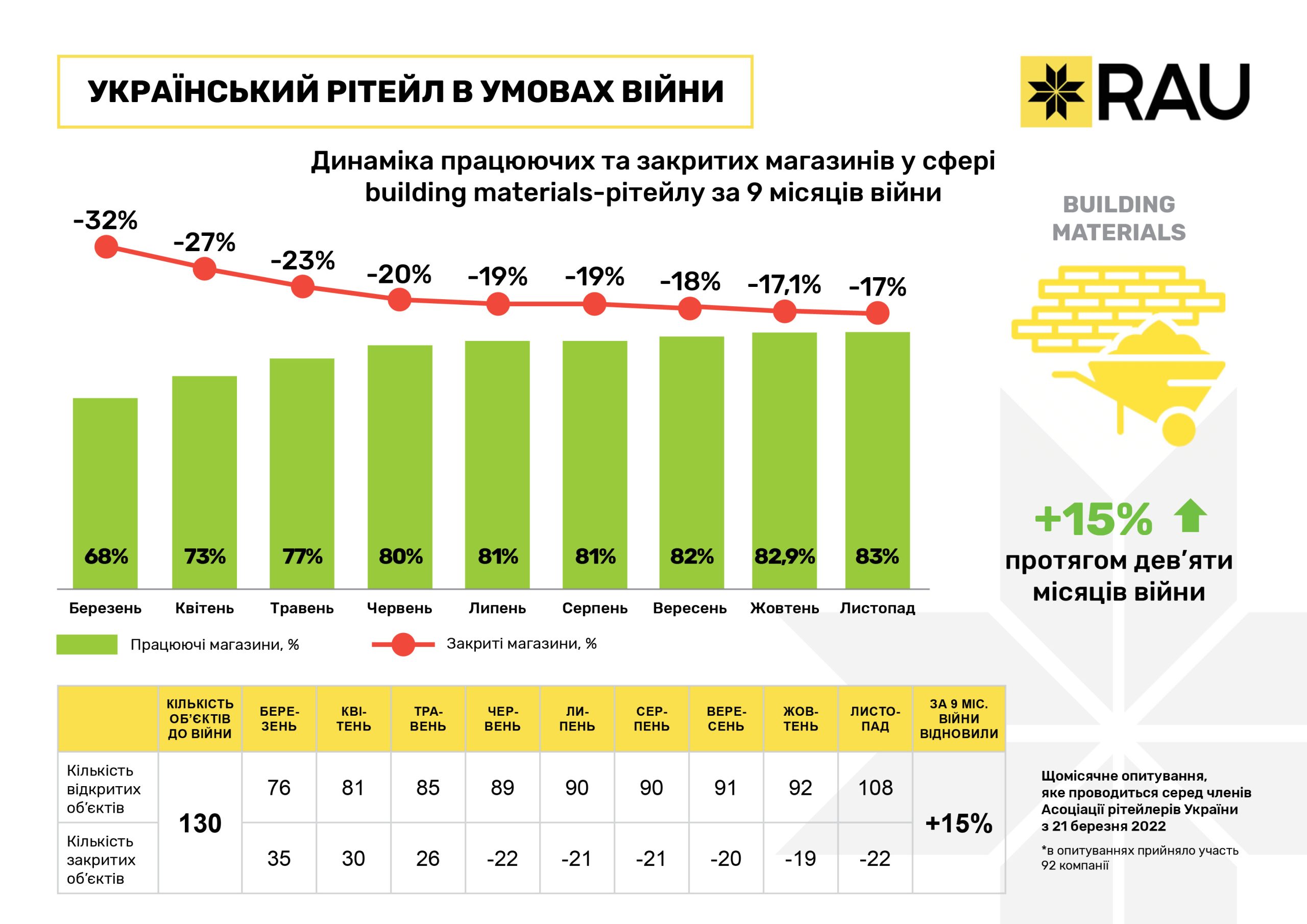 Торговля стройматериалами, хоть и упала в начале войны, но чувствовала себя гораздо лучше даже по сравнению с сектором БТиЭ. Так, по состоянию на март было закрыто по разным причинам 32% из 130 магазинов, а уже в октябре эта доля уменьшилась до 17%, которая сохраняется до сих пор. Данная разновидность торговли демонстрирует очень плавную динамику обновления, увеличив долю работающих магазинов на 15% за март-ноябрь.