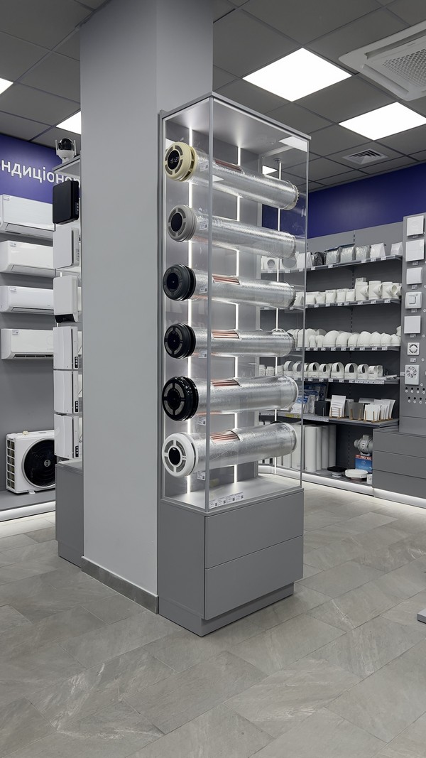 Планируя открытие третьего магазина в Киеве (и четвертого в Украине), компания обратилась к дизайнерам, чтобы создать что-то не похожее на предыдущие магазины, с использованием обновленной айдентики. Основная задача заключалась в создании удобного для клиентов шоу-рума с логичным расположением ключевых групп товаров – систем вентиляции, водонагревателей, обогревателей, кондиционеров, газовых и электрических котлов, фильтров для очистки воды.