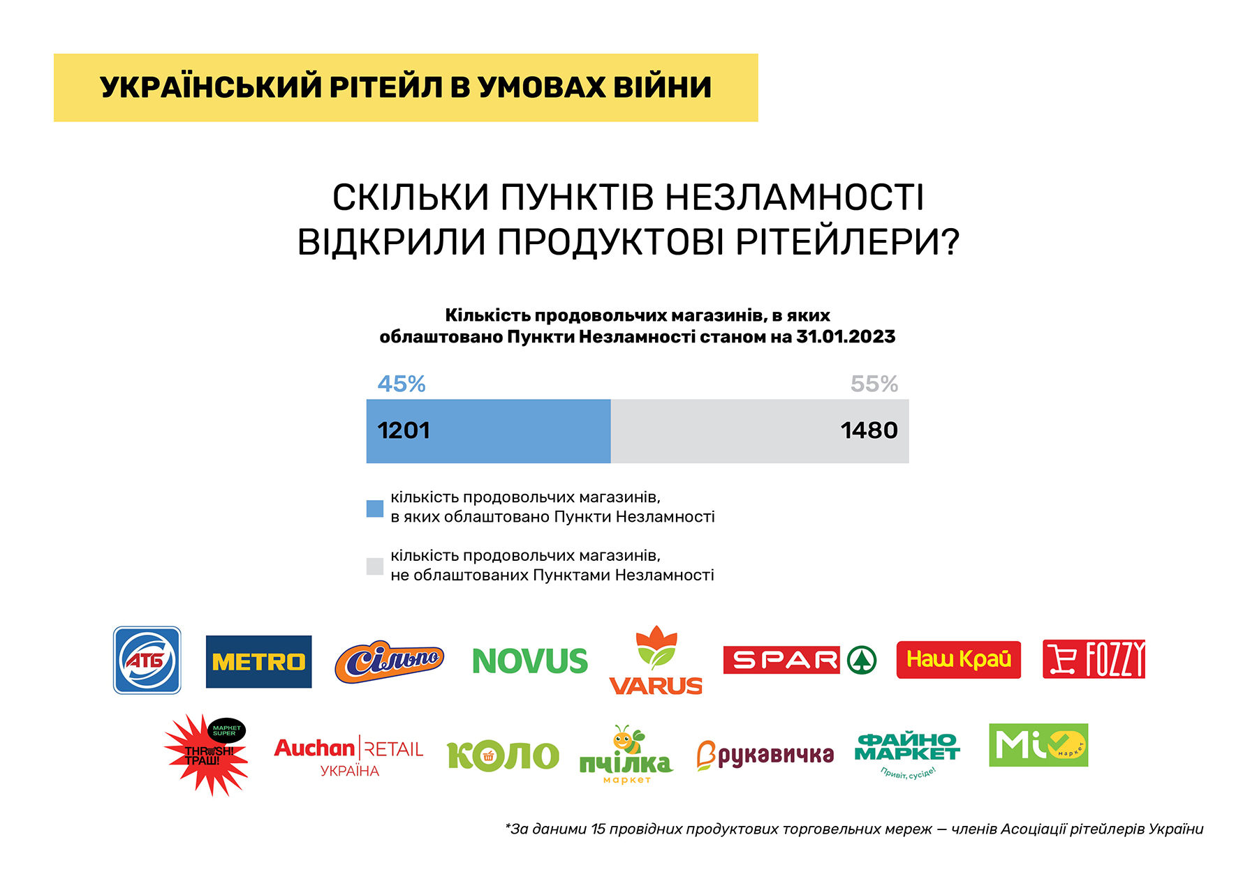 Но даже в этих условиях ритейл не отказывается от своей ответственности перед украинцами и за свой счет обустраивает многочисленные “Пункты несокрушимости”. Большинство торговых точек оборудованы местами отдыха, зарядными станциями для гаджетов, а также снабжены автономным бесперебойным электроснабжением (питаются от генераторов), что позволяет принимать посетителей во время отключений электроэнергии. Об этом свидетельствуют данные опроса, проведенного Ассоциацией ритейлеров Украины в конце января 2023 среди 15 ведущих украинских торговых сетей – членов RAU.