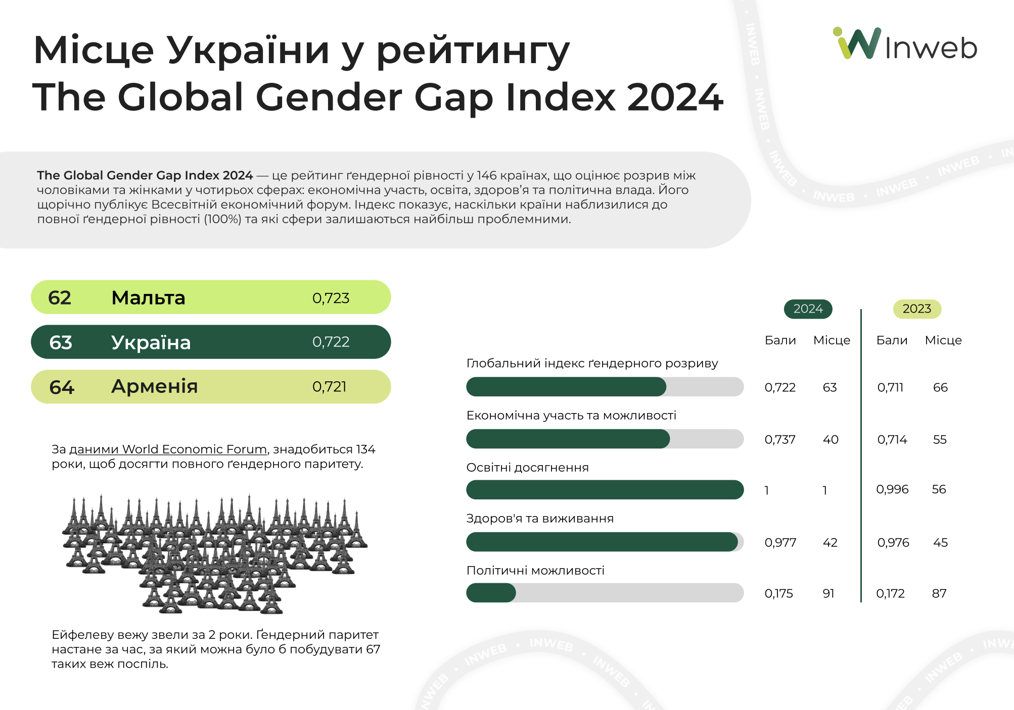 Украина заняла 63 место из 146 в The Global Gender Gap Index 2024, индексе, который измеряет уровень гендерного равенства в разных странах мира. В 2023 году Украина занимала 66-е место в этом же индексе, поэтому это улучшение на три позиции.