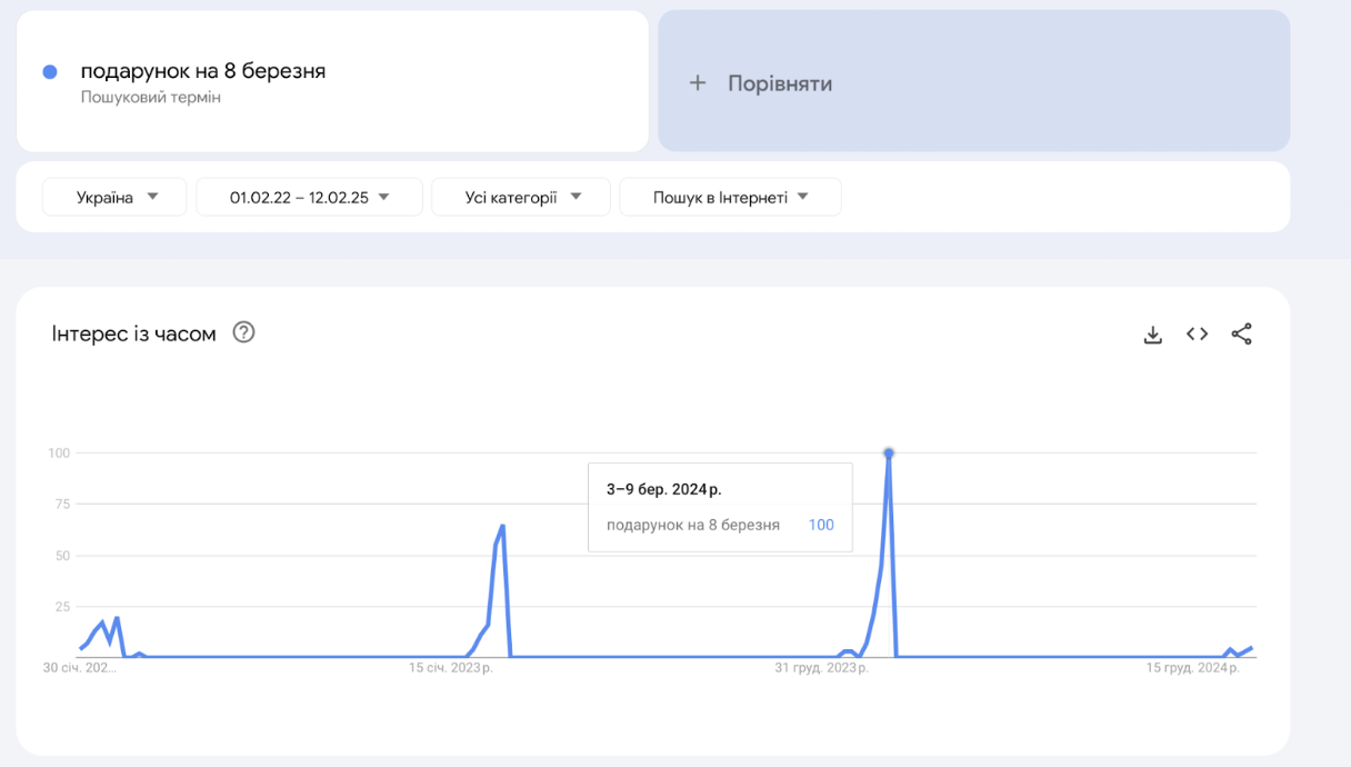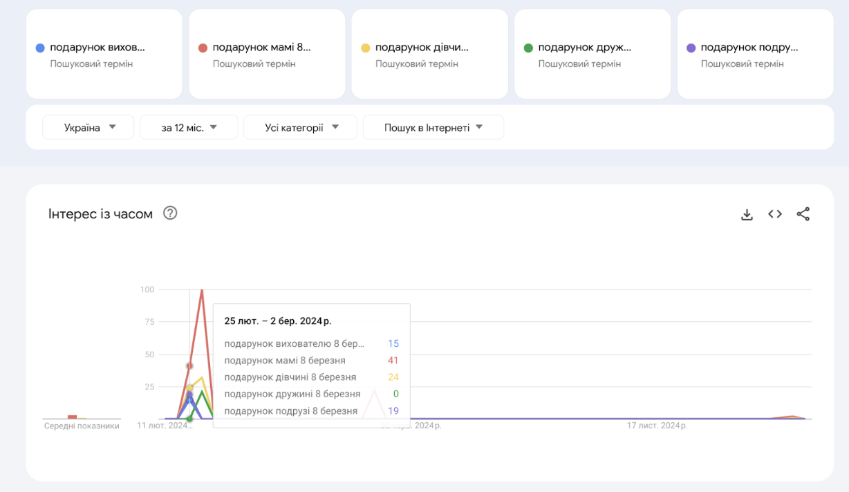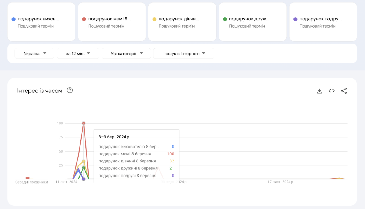 Прослеживая статистику запроса, в период с 25 февраля по 2 марта 2024 года украинцы интересовались подарками для мамы, девушки и подруги на 8 марта.