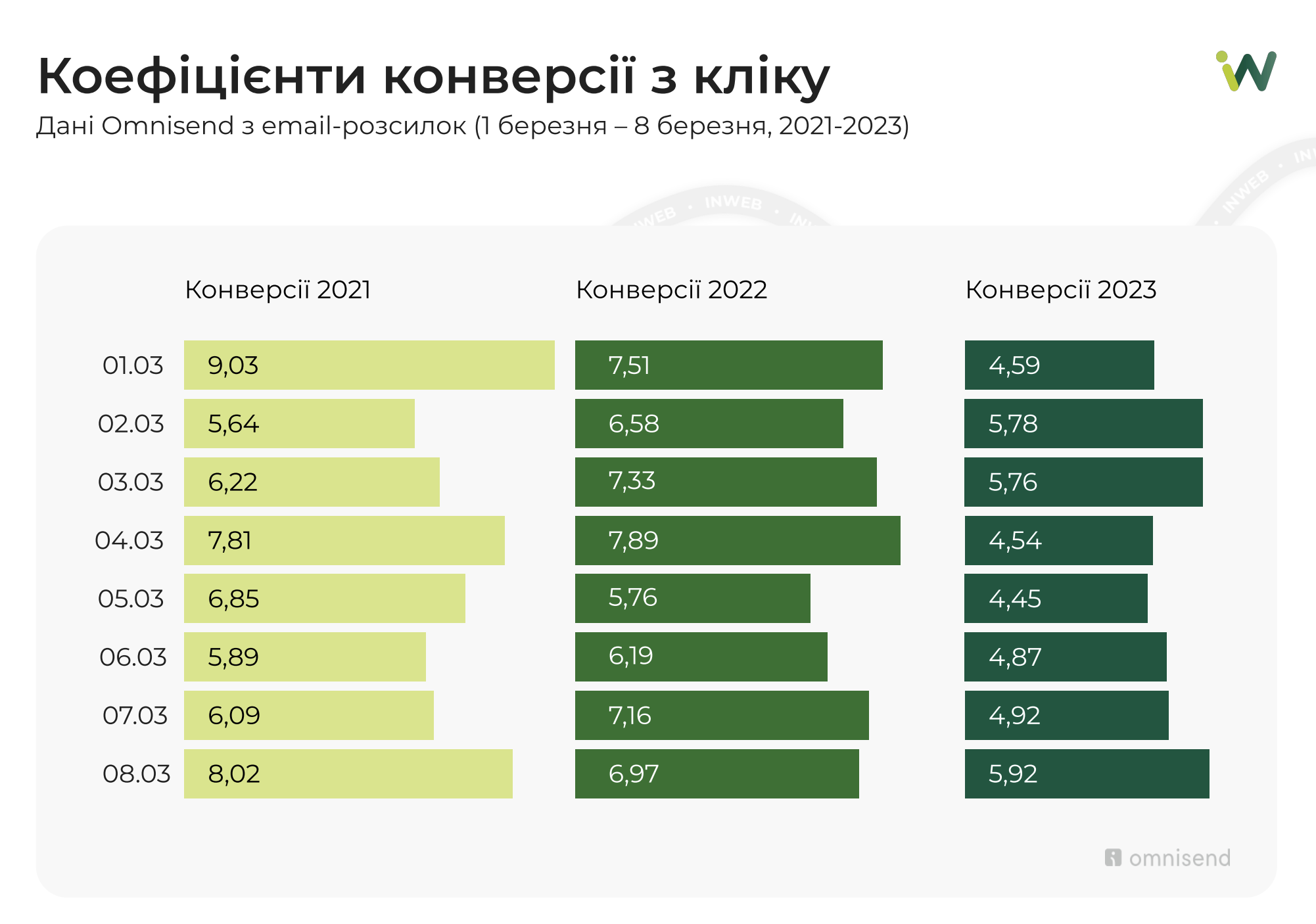Согласно данным Omnisend, в 2023 году в email-маркетинге в период с первого по восьмое марта уровень конверсии снизился по сравнению с 2021 и 2022 годами.
