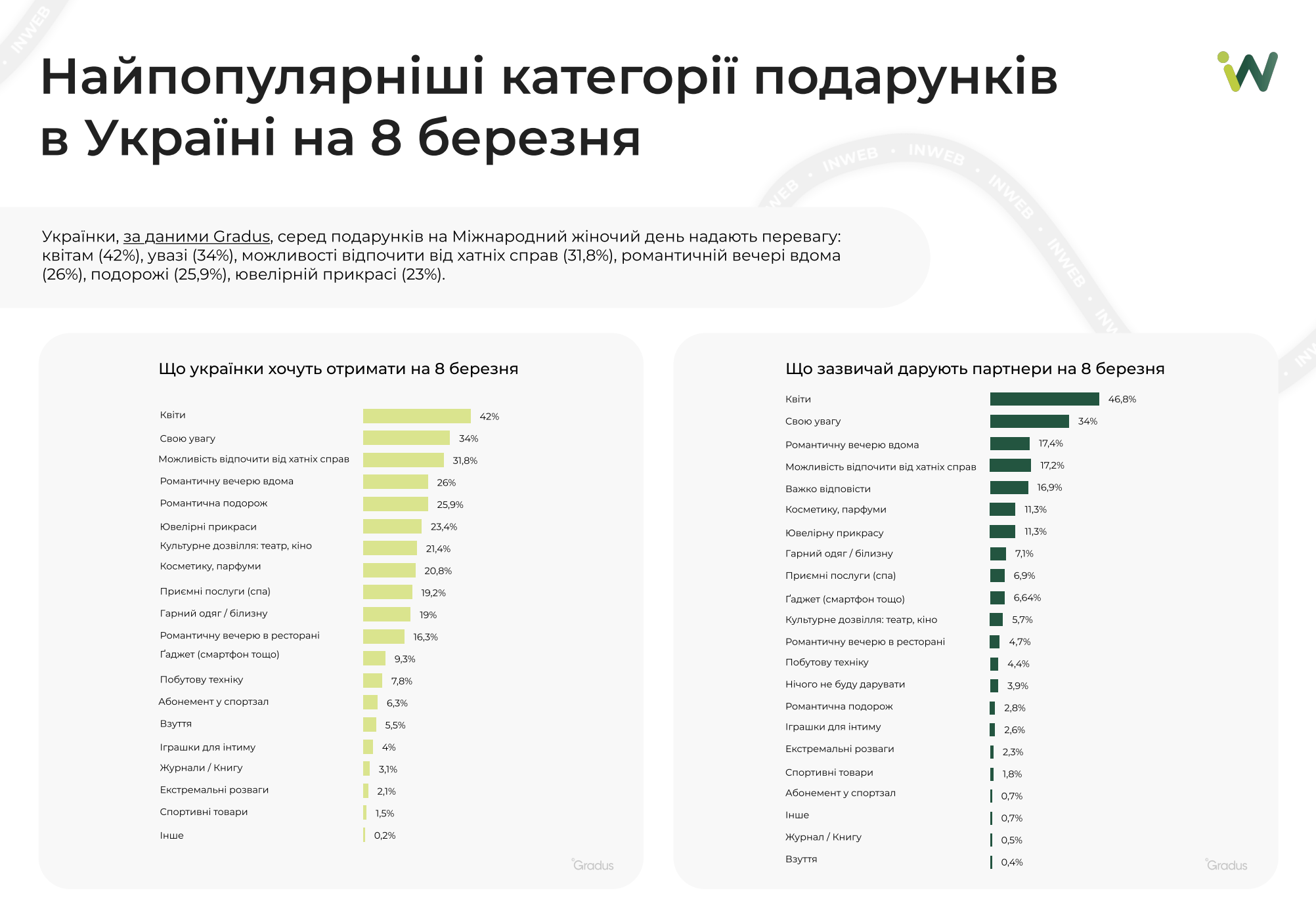 Украинки, по данным Gradus, среди подарков на Международный женский день предпочитают: цветы (42%), внимание (34%), возможность отдохнуть от домашних дел (31,8%), романтический ужин дома (26%), путешествия (25,9%), ювелирное украшение (23%).
