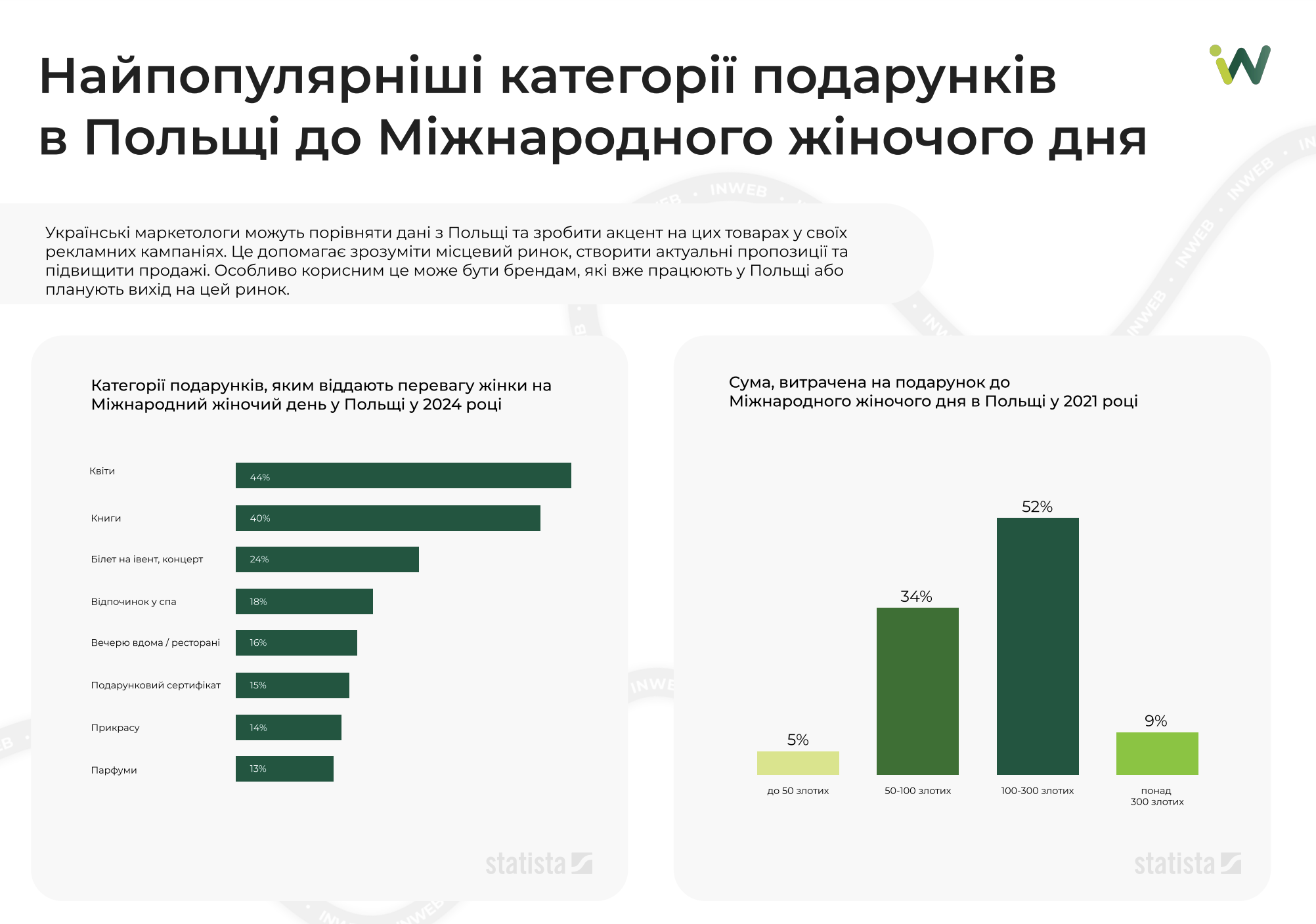 В среднем, в 2021 году, 52% мужчин в Польше потратили 100-300 злотых на подарок женщине на Международный женский день.