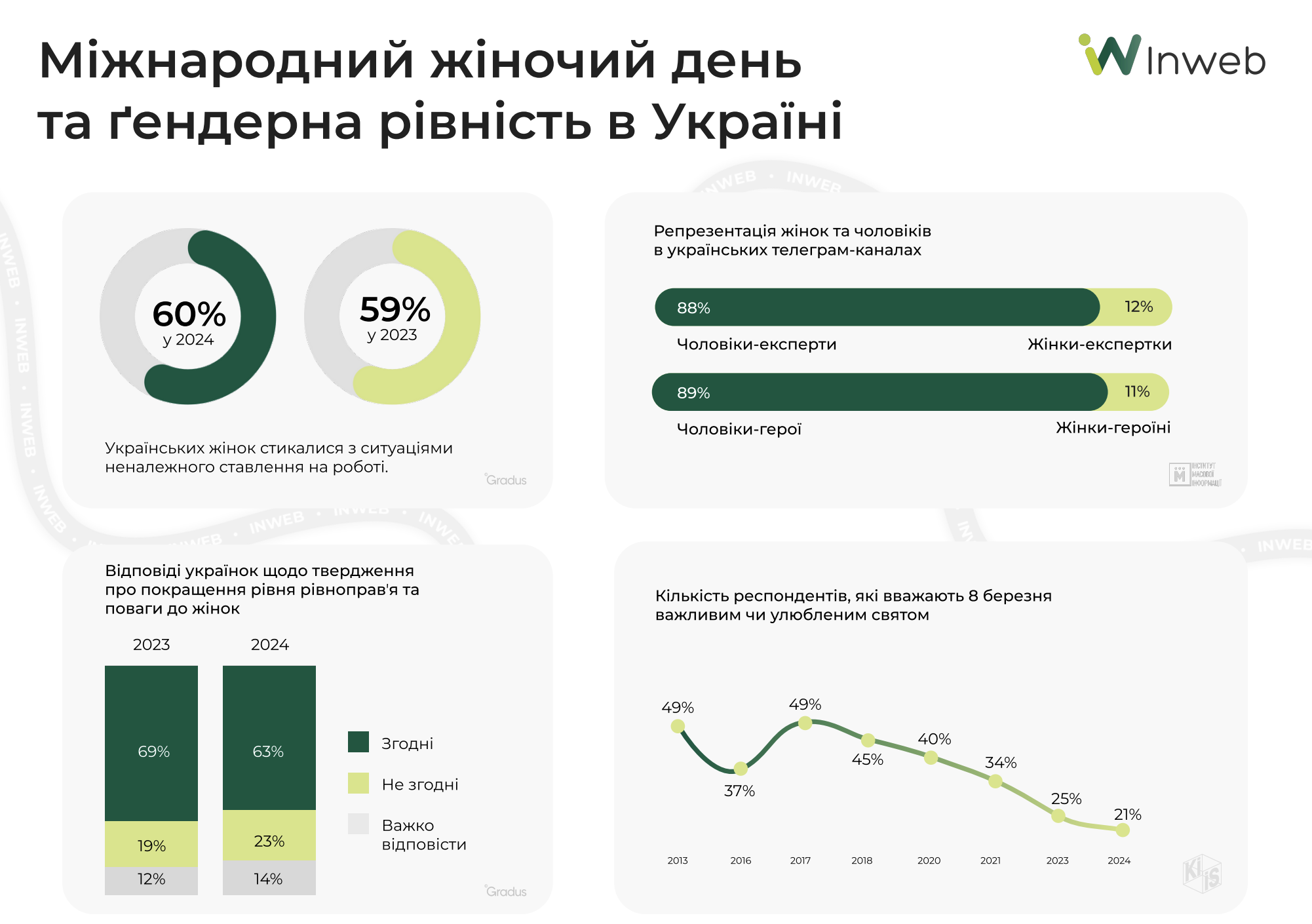 В 2024 году 23% женщин в Украине отметили, что не чувствуют улучшения в уровне уважения и равноправия. Для сравнения в 2023 году этот показатель составлял 19%.