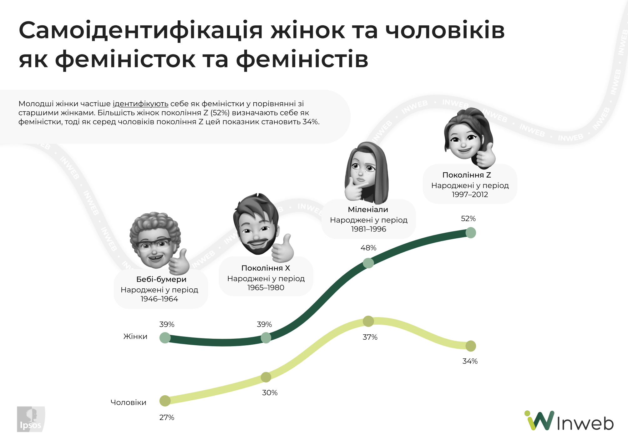 Молодые женщины чаще идентифицируют себя как феминистки по сравнению со старшими женщинами. Большинство женщин поколения Z (52%) определяют себя как феминистки, тогда как среди мужчин поколения Z этот показатель составляет 34%.
