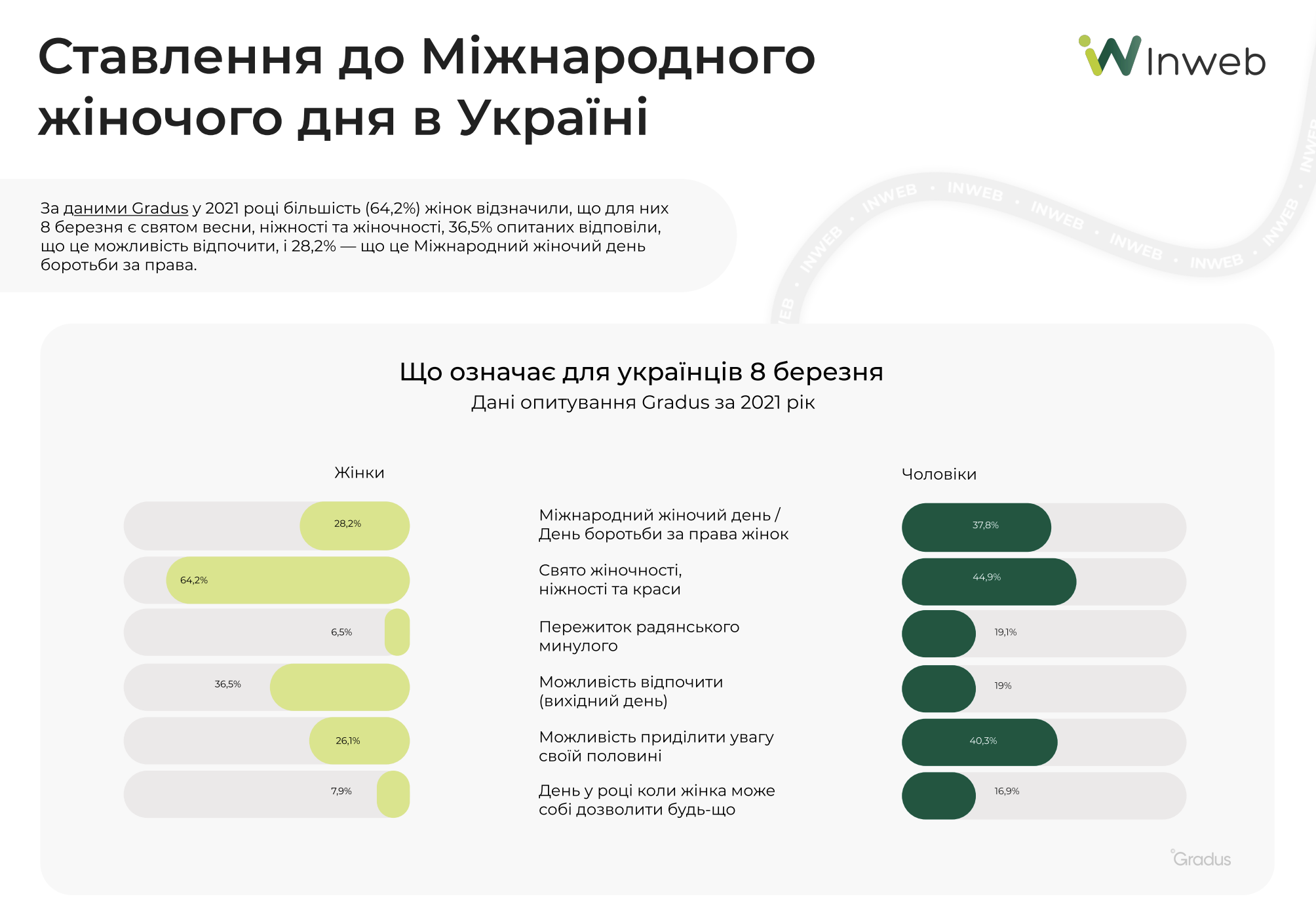 По данным Gradus в 2021 году большинство (64,2%) женщин отметили, что для них 8 марта является праздником весны, нежности и женственности, 36,5% опрошенных ответили, что это возможность отдохнуть, и 28,2% – что это Международный женский день борьбы за права.