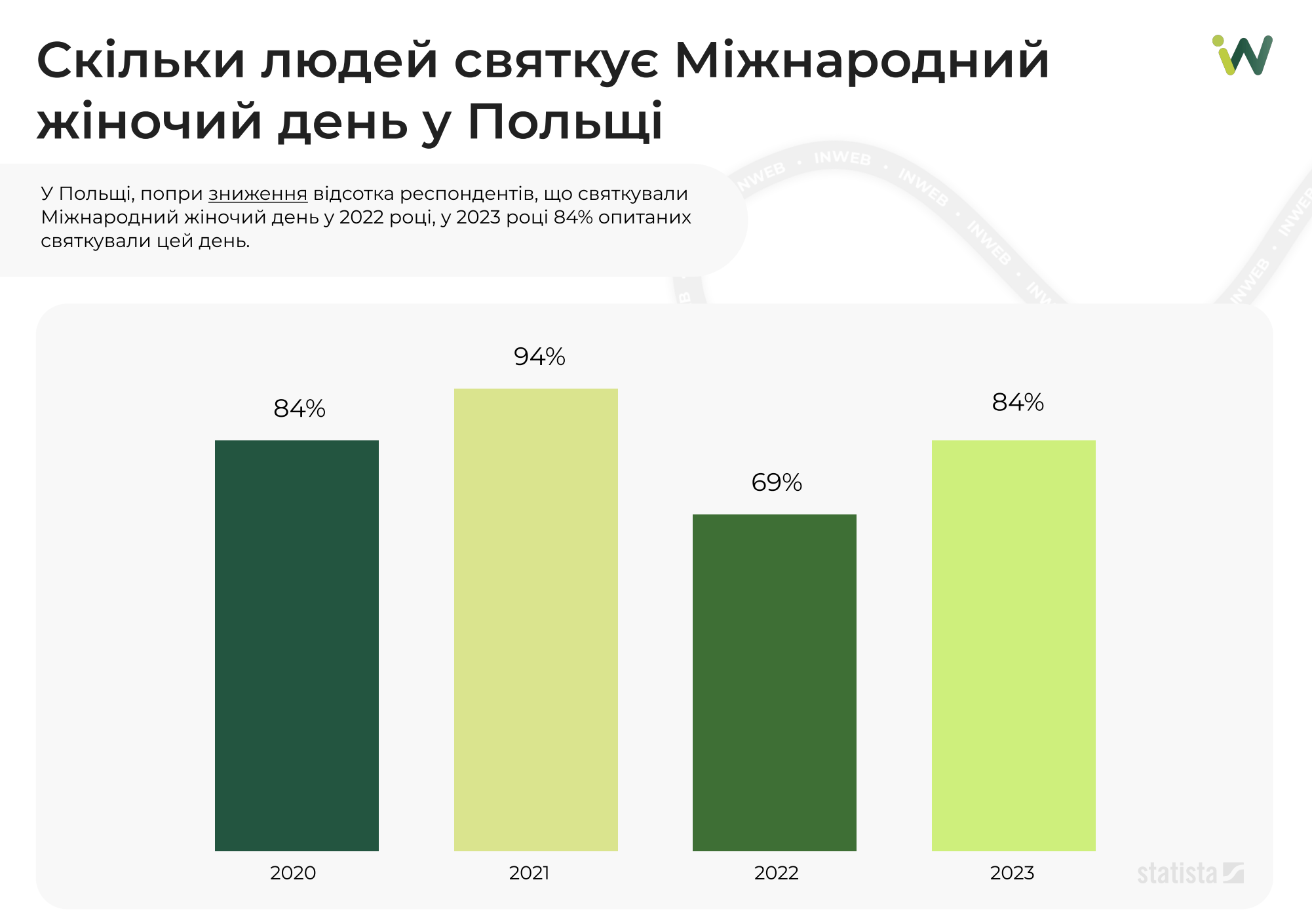 В Польше, несмотря на снижение процента респондентов, которые праздновали Международный женский день в 2022 году, в 2023 году 84% опрошенных праздновали этот день.