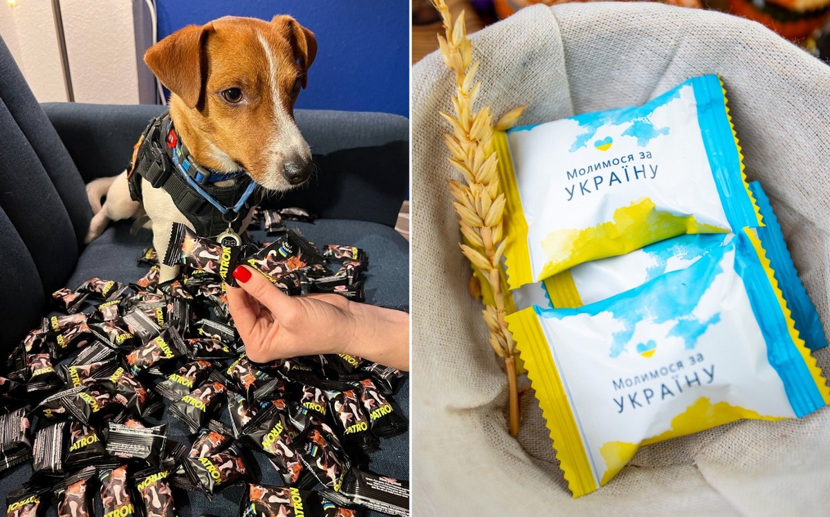 Конфеты «Пес Патрон». Кондитерская фабрика LUKAS начала выпускать конфеты подобные уже популярным вкусностям этого производителя — конфет «Тузя», однако посвятив название героической собачке Патрону и изобразив его на обертке. С началом полномасштабной войны Патрон стал самой известной собакой страны. У него есть государственная награда, собственная страница в соцсетях и вышиванка. Отныне его именем еще и увенчали грильяжные конфеты из семян подсолнечника в шоколадной глазури. Кроме конфет с Патроном, на полках ритейлеров можно найти новое лакомство от LUKAS из нежного суфле в шоколаде «Лукася» в патриотической упаковке. На сине-желтых обертках сделали надписи «Молимся за Украину», «Берегите себя и Украину», «Украина превыше всего», «Все будет Украина».