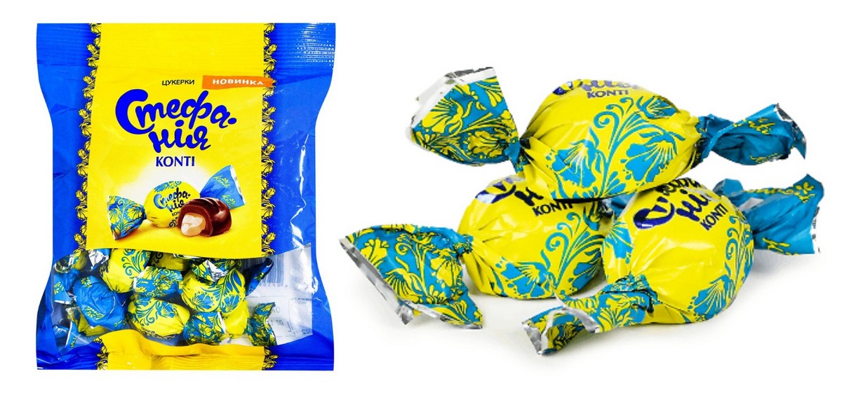 Конфеты «Стефанія». В прошлом году кондитерская фабрика Конти выпустила конфету «Стефанія» в честь песни украинской фольк-рэп группы Kalush Orchestra, с которой группа победила на конкурсе Евровидения-2022. Это помадная конфета с добавлением коньяка и желейной начинки из какао. Дизайн упаковки выполнен в патриотических желто-голубых цветах.
