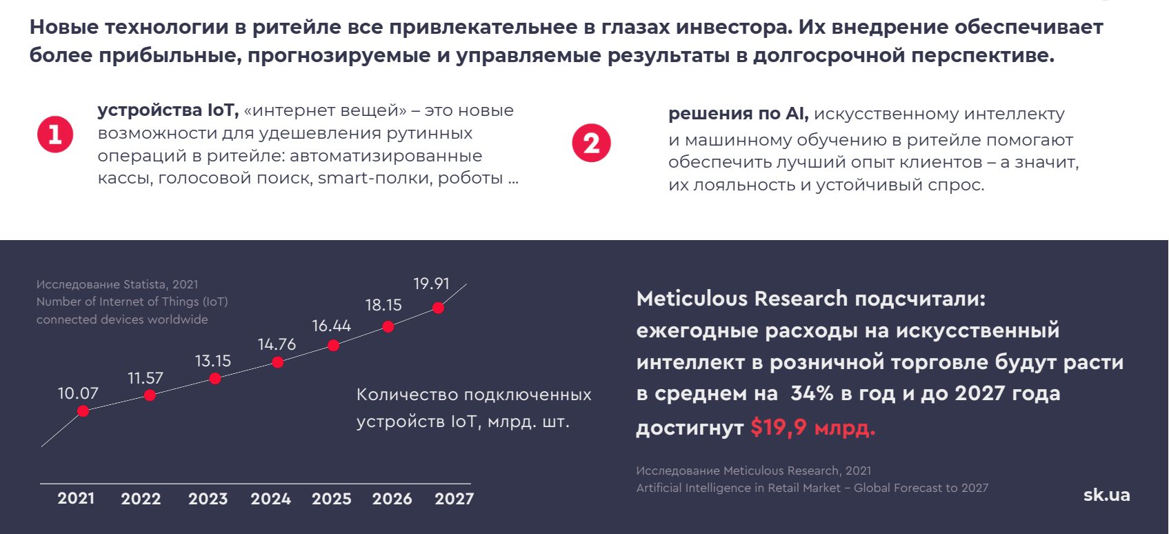 Тем не менее, новые технологии в ритейле все привлекательнее в глазах инвестора. Их внедрение обеспечивает более прибыльные, прогнозируемые и управляемые результаты в долгосрочной перспективе.