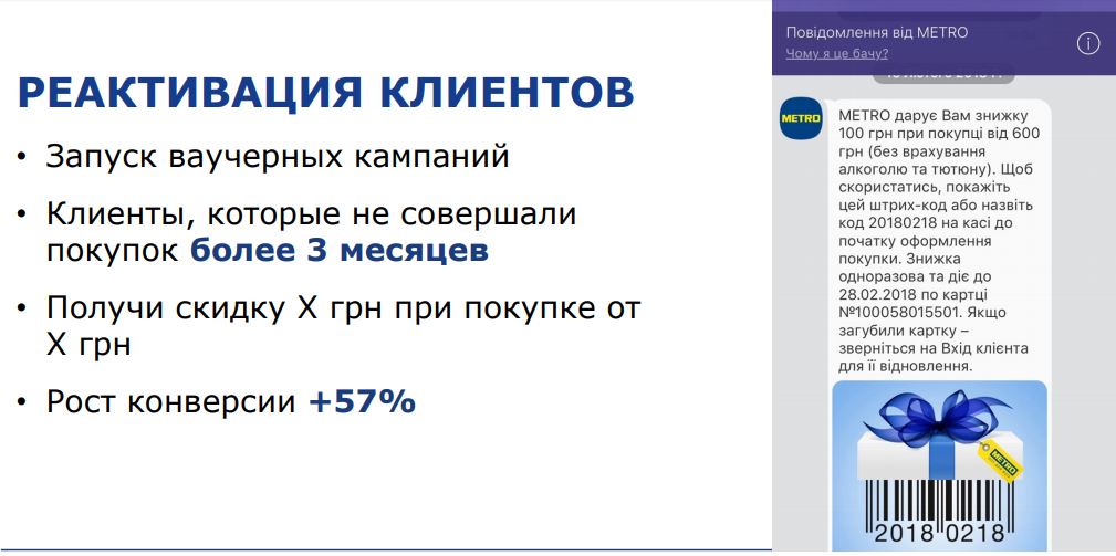 Еще одна группа клиентов – те, которые переставали ходить в сеть, и нужно было их удержать. Для первой кампании, взяли потребителей, которые не совершали покупку в ТЦ более трех месяцев и начали слать им ваучеры со скидкой. К примеру: «Совершите покупку на 600 грн и получите скидку в 100 грн».