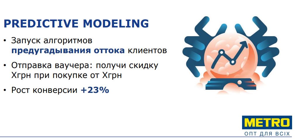 Еще один тип кампаний – это предугадывание: задачей аналитиков было создание алгоритма, чтобы определить, кто из клиентов может перестать посещать магазин. Соответственно, им тоже начали отправлять ваучеры.