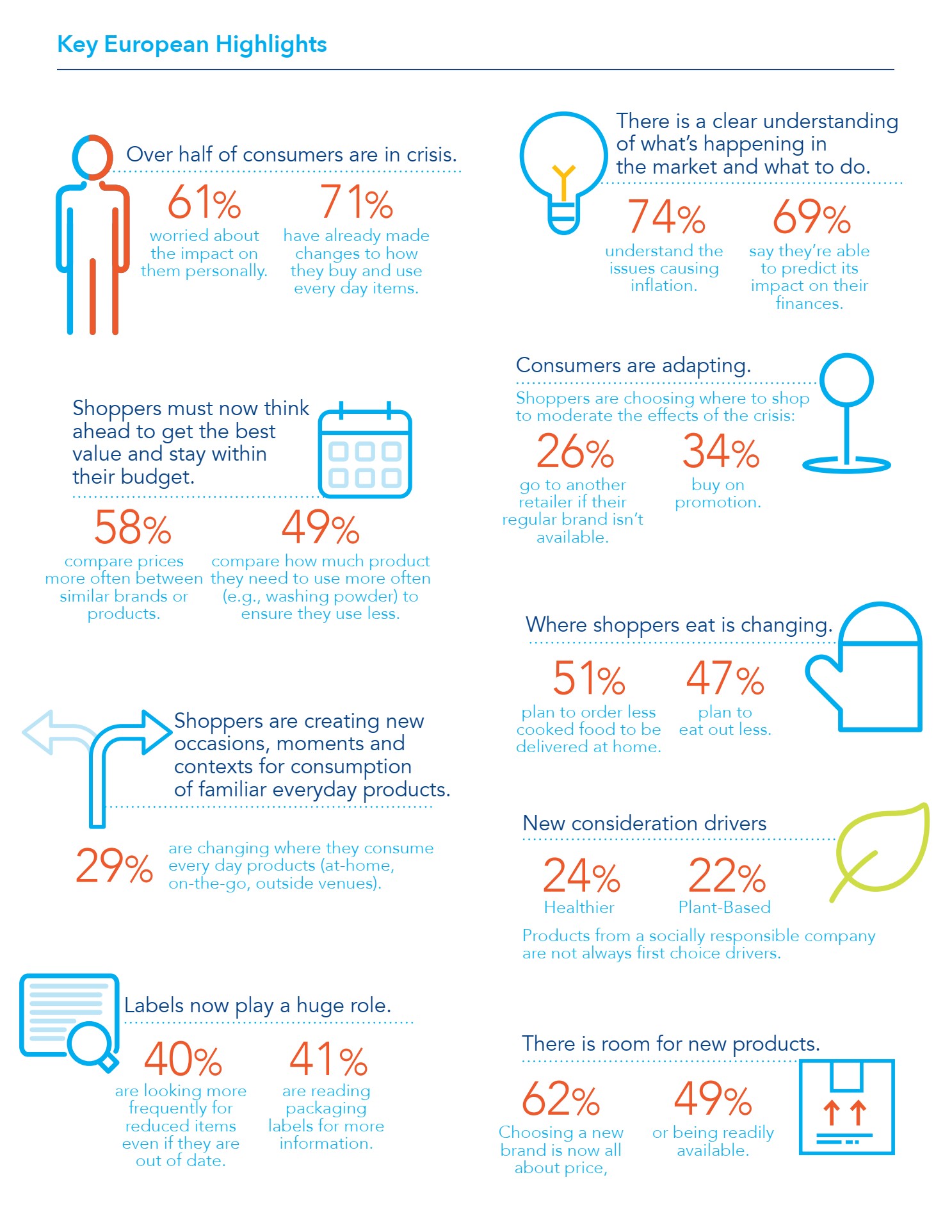 Покупателям приходится адаптироваться, поскольку инфляционное давление вынуждает цены в супермаркетах расти. В сочетании с более высокими ценами на энергоносители, медленным ростом заработной платы и дефицитом предложения покупатели делают трудный выбор в своих повседневных затратах. Многие полагаются на личные сбережения, чтобы выжить. Поэтому во многих случаях их поведение подобно поведению их родителей, дедушек и бабушек из 70-х и 80-х годов.