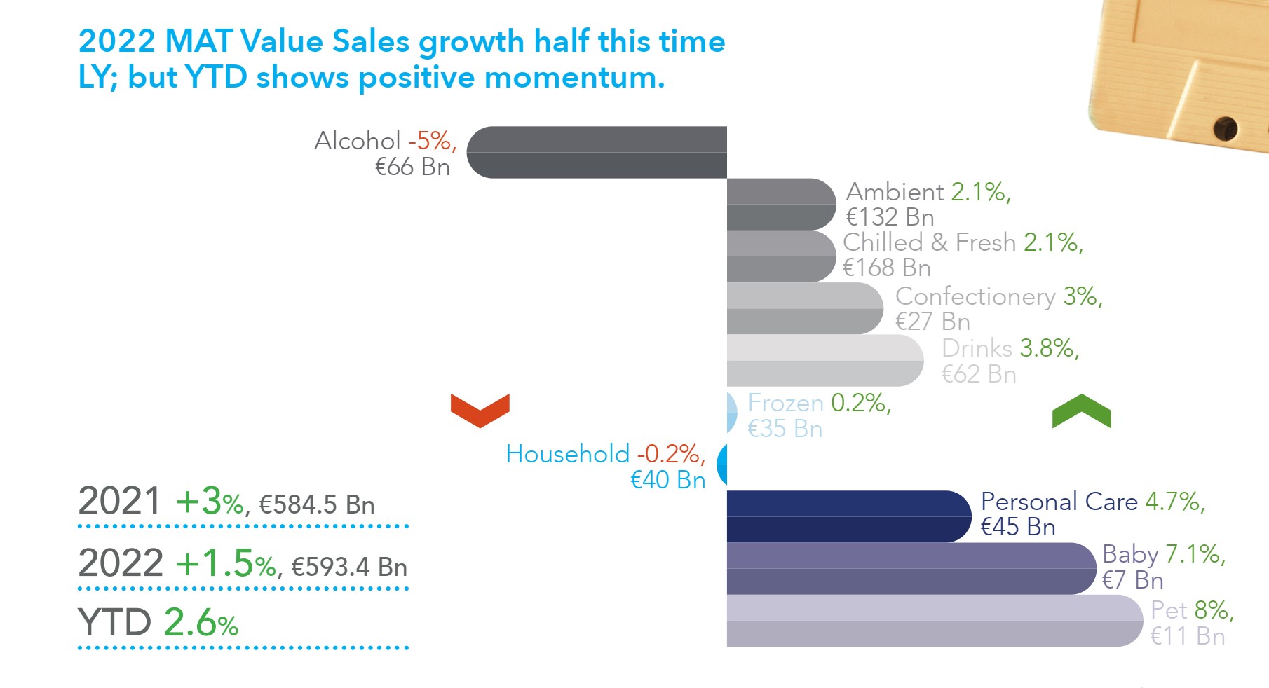 В 2022 году картина для FMCG выглядит совсем по-иному, чем в годы пандемии. Так, продажи товаров категории FMCG за год (июль 2021 года по июль 2022-го) выросли на 1,5% или на 9 млрд евро, а объем продаж составил 593,4 млрд евро.
