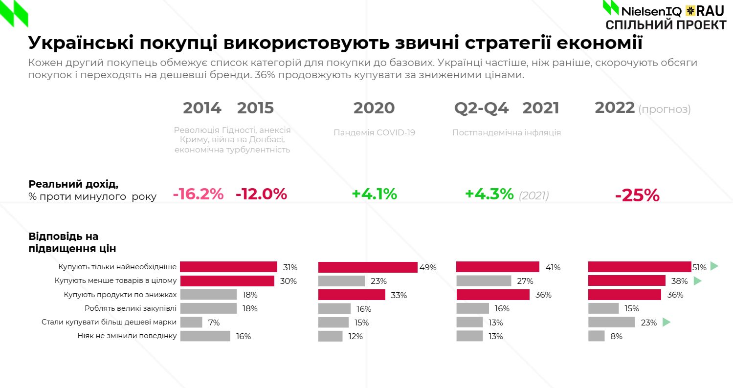 Ежеквартально Nielsen опрашивает украинцев о том, как они совершают свои покупки (Shopper trends). Здесь заметны два излюбленных способа экономии, применение которых с началом войны только усилилось. Первая стратегия предполагает покупки только основных товаров, необходимых для выживания. Вторая стратегия состоит в том, чтобы покупать те же бренды, уменьшая объем. К тому же украинцы являются настоящими промо-хантерами, поэтому охота за скидками только усилилась.