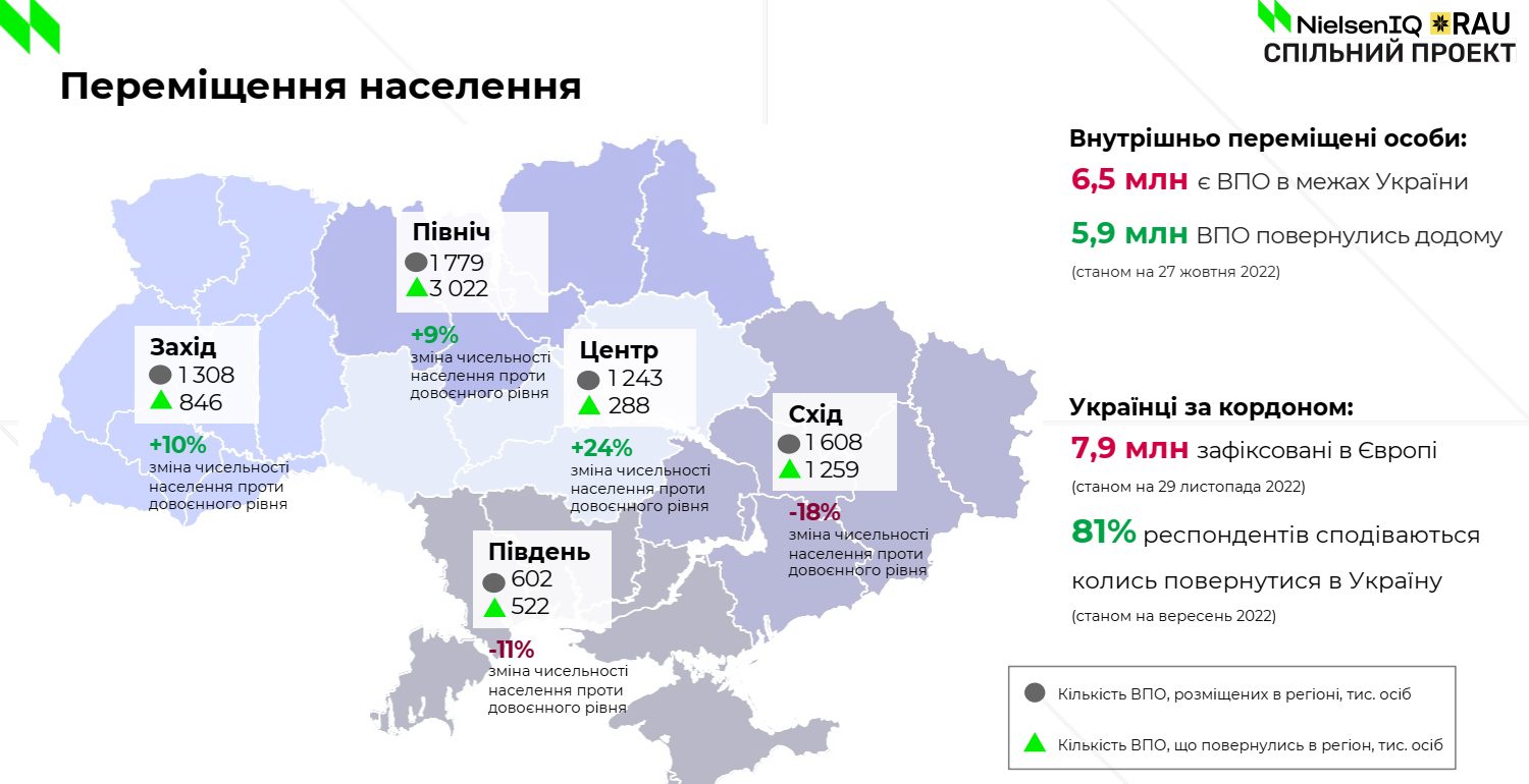 В Украине появилось новое понятие – внутренне перемещенные лица. Люди массово уехали из южных и восточных регионов. В центре, на севере и западе страны происходит прирост за счет тех, кто переехал, или даже уже вернулся из эвакуации. Это, например, хорошо заметно именно в северных регионах. Согласно опросам, 81% хотят вернуться домой.