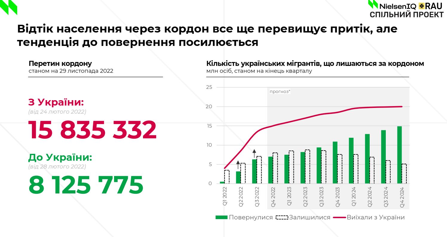 Но еще многие остаются за границей. Начиная с 24 февраля из Украины выехало 15,8 млн человек и в настоящее время уже вернулись около 8 млн человек. По этому поводу у аналитиков НБУ достаточно оптимистичные прогнозы: количество возвращающихся будет расти.