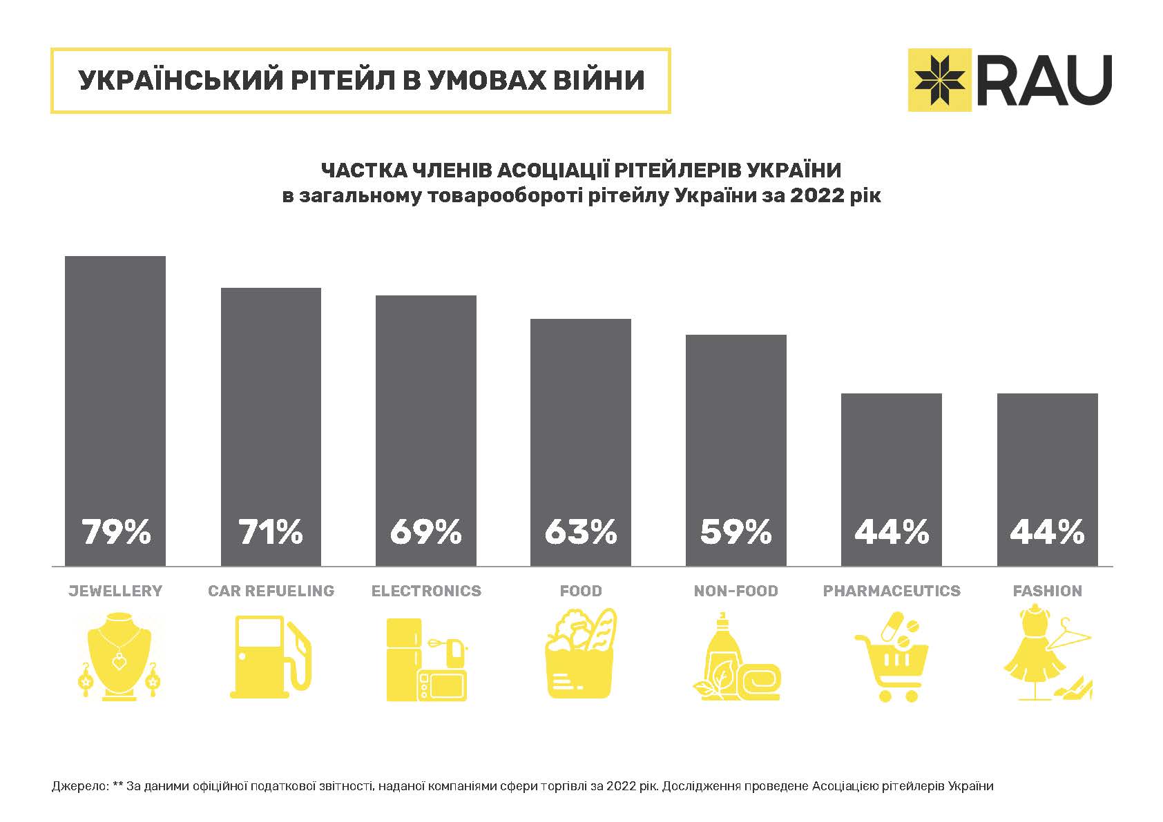 В общем, компании, входящие в RAU, формируют заметную долю в общем товарообороте сетевых игроков. Наиболее полно они представлены в ювелирной сфере – 79%. С этого направления в Ассоциацию входят все ведущие игроки: Золотой Возраст, Укрзолото, SOVA, Автозаправки, являющиеся членами RAU, обеспечивают 71% общей выручки сектора, магазины техники и электроники – 69%, продуктовые ритейлеры – 63% и т.д.