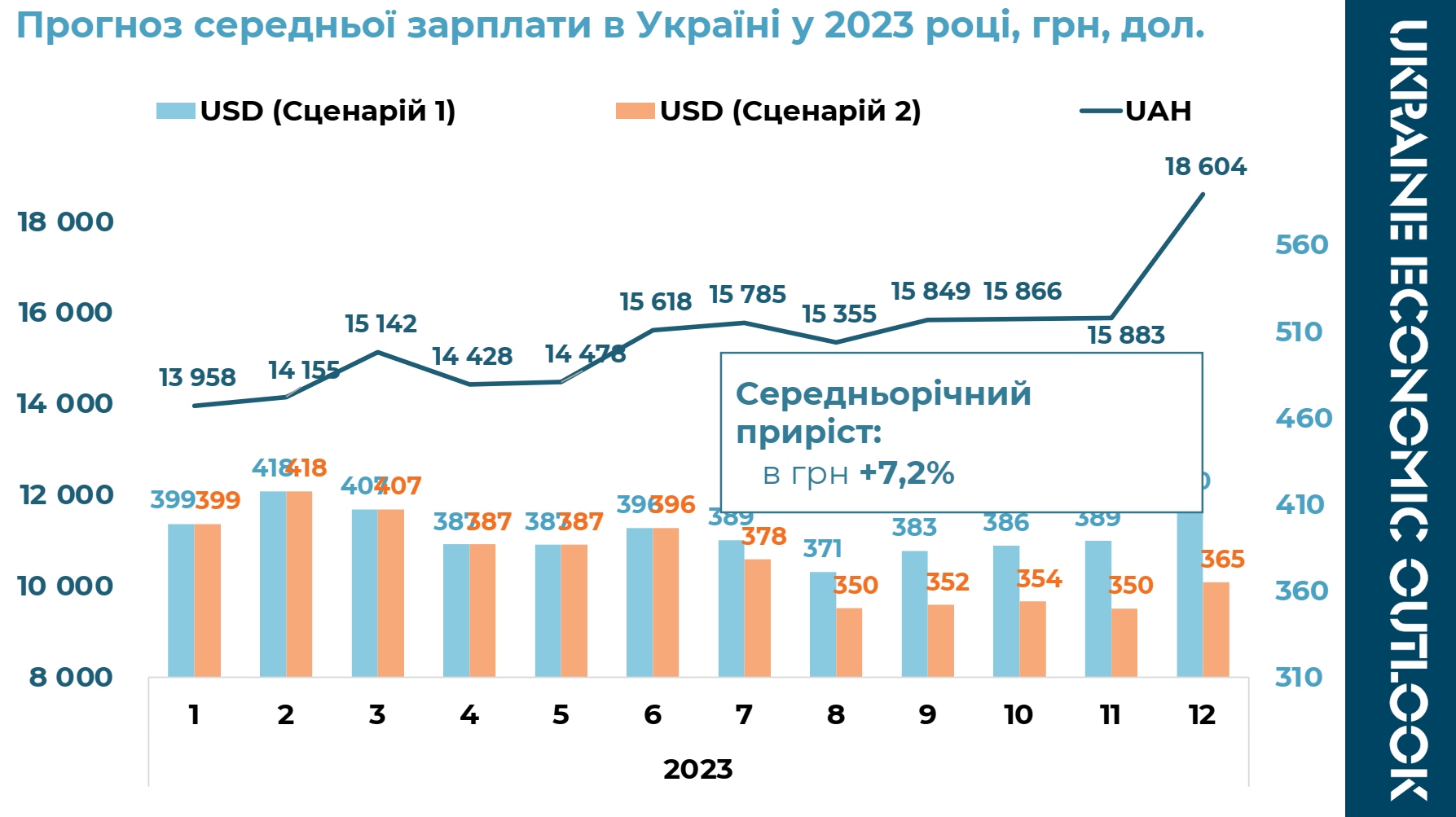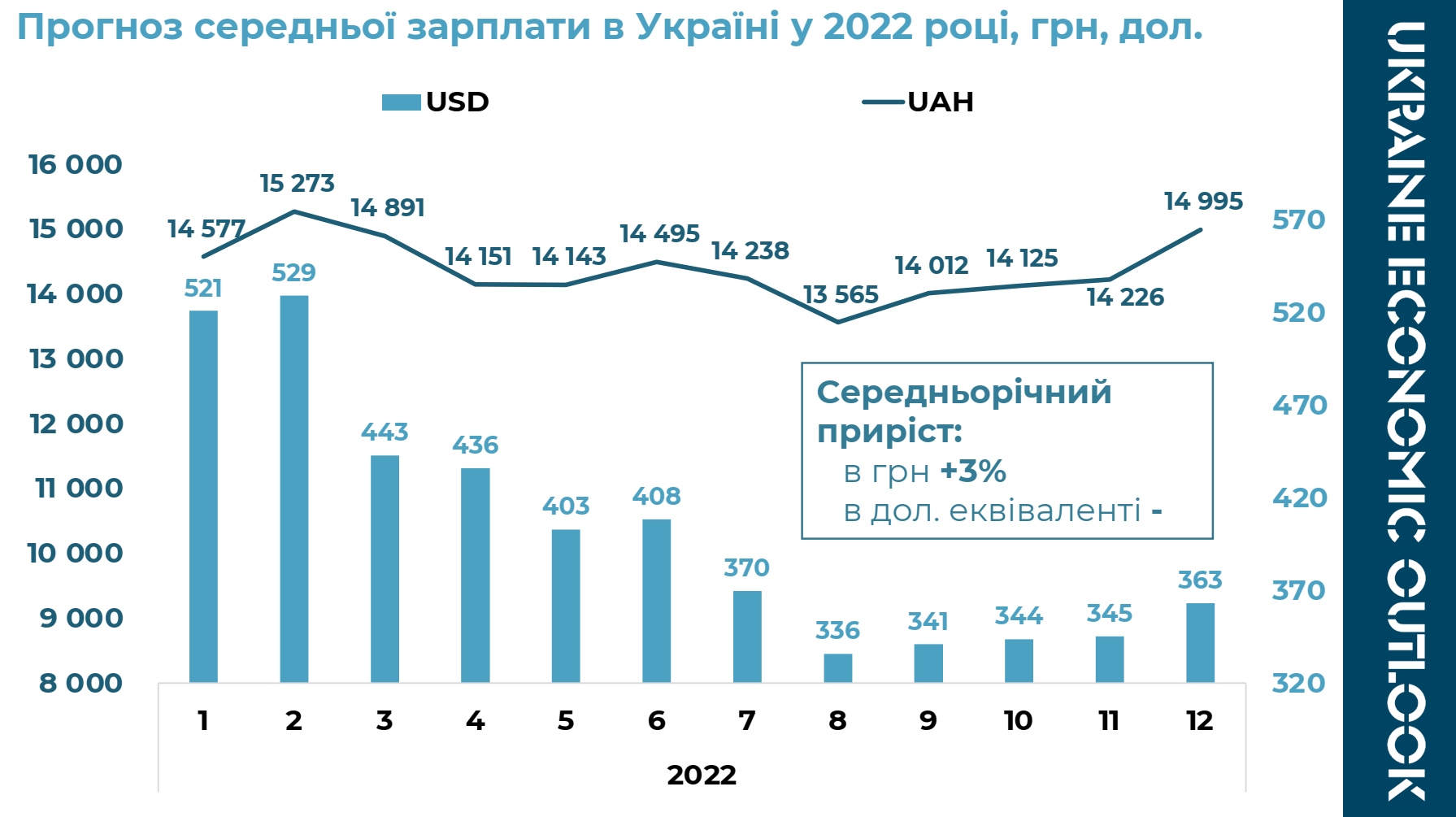 На следующий год, учитывая, что война продлится весь год, прогнозируется 10% девальвация гривны и, соответственно: при сохранении номинальных зарплат, упадет их покупательная способность как в гривневом, так и в долларовом эквиваленте. Но в конце следующего года ожидается заметный рост зарплат, в том числе за счет того, что в некоторых регионах уже ощущается нехватка рабочей силы.