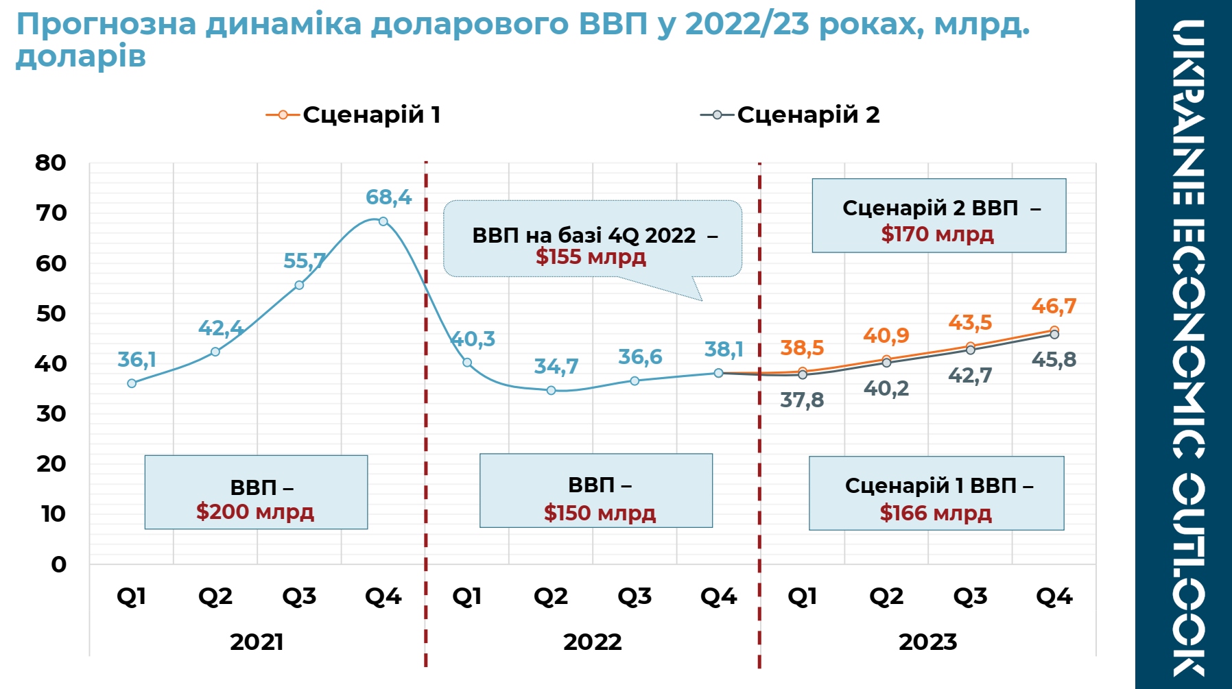 Даже по умеренно-пессимистическому сценарию, предусматривающему продолжение войны весь 2023 год, в следующем году ожидаем рост ВВП в долларовом эквиваленте почти на 10%, до $165-170 млрд.