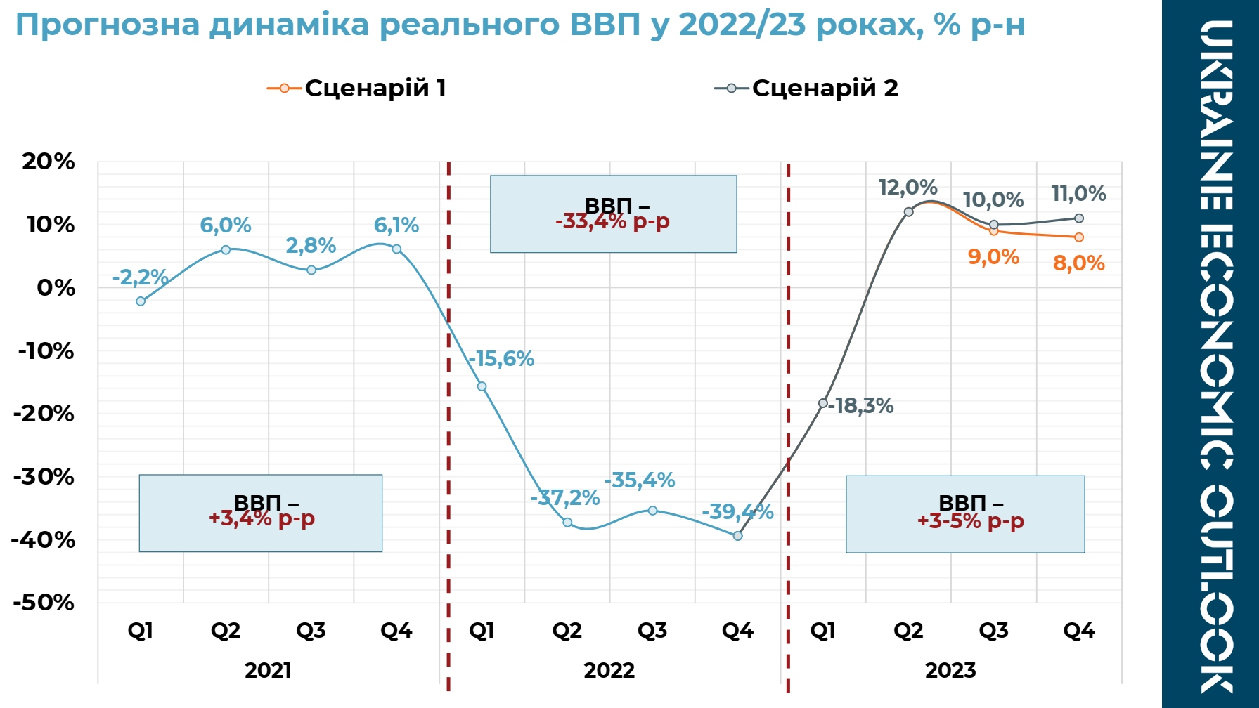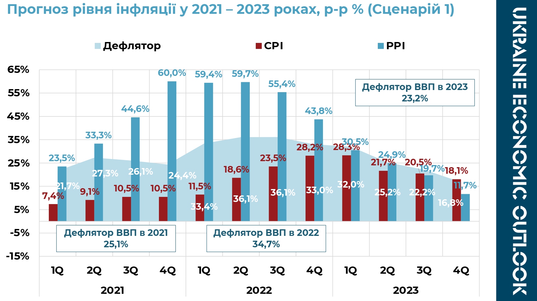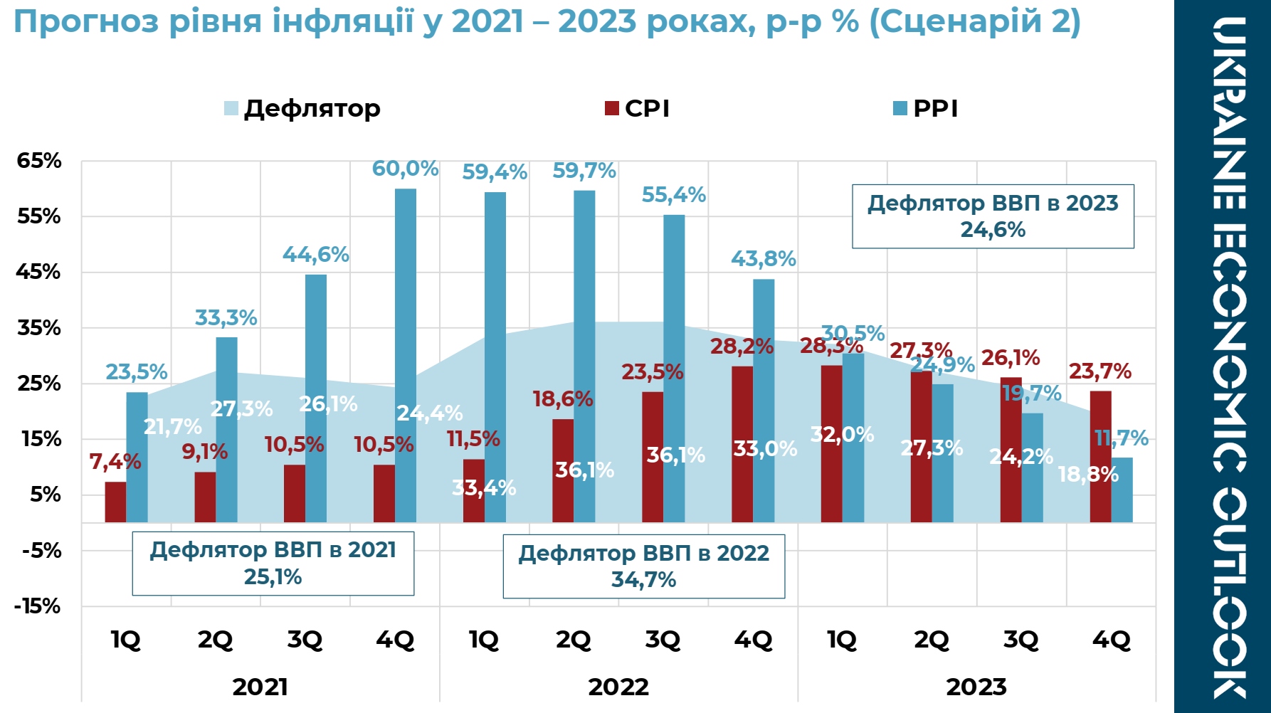 По второму сценарию свою роль играют такие важные факторы как повышение тарифов на услуги ЖКХ и увеличение минимальной зарплаты до 6700 грн. Как известно, тарифы искусственно сдерживаются властью и впоследствии будут повышены. А размер минимальной зарплаты в 6700 уже действует с 1 октября 2022 года. Все это по-другому повлияет на совокупный потребительский спрос: выторги ритейла возрастут, но потребительская инфляция будет на уровне 23,7% (а не 18%). Дефлятор ВВП, соответственно, прогнозируется на уровне почти 25%.