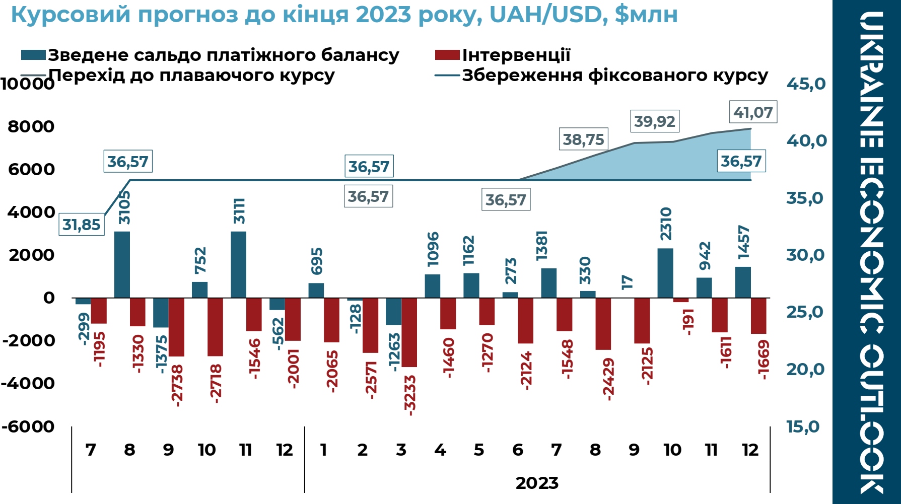 Учитывая, что наличными в Украине продается только 10% иностранной валюты, а 90% – на бирже, прогнозы какого-то «настоящего» курса черного рынка выглядят довольно мифическими. В самом деле, данные платежного баланса Украины неутешительны и экспортеры могут быть недовольны фиксированным курсом НБУ на уровне 36,57 грн/$. Однако, если и в 2023 году, как летом 2022-го, Нацбанку придется реагировать, чтобы улучшить состояние экспортеров, возможен вариант перехода к плавающему обменному курсу. Тогда на конец 2023 года обменный курс может дойти до отметки в 41,07 грн/$. В противном случае для удержания фиксированного курса на нынешнем уровне придется также интенсивно проводить интервенции иностранной валюты, сжигая резервы.