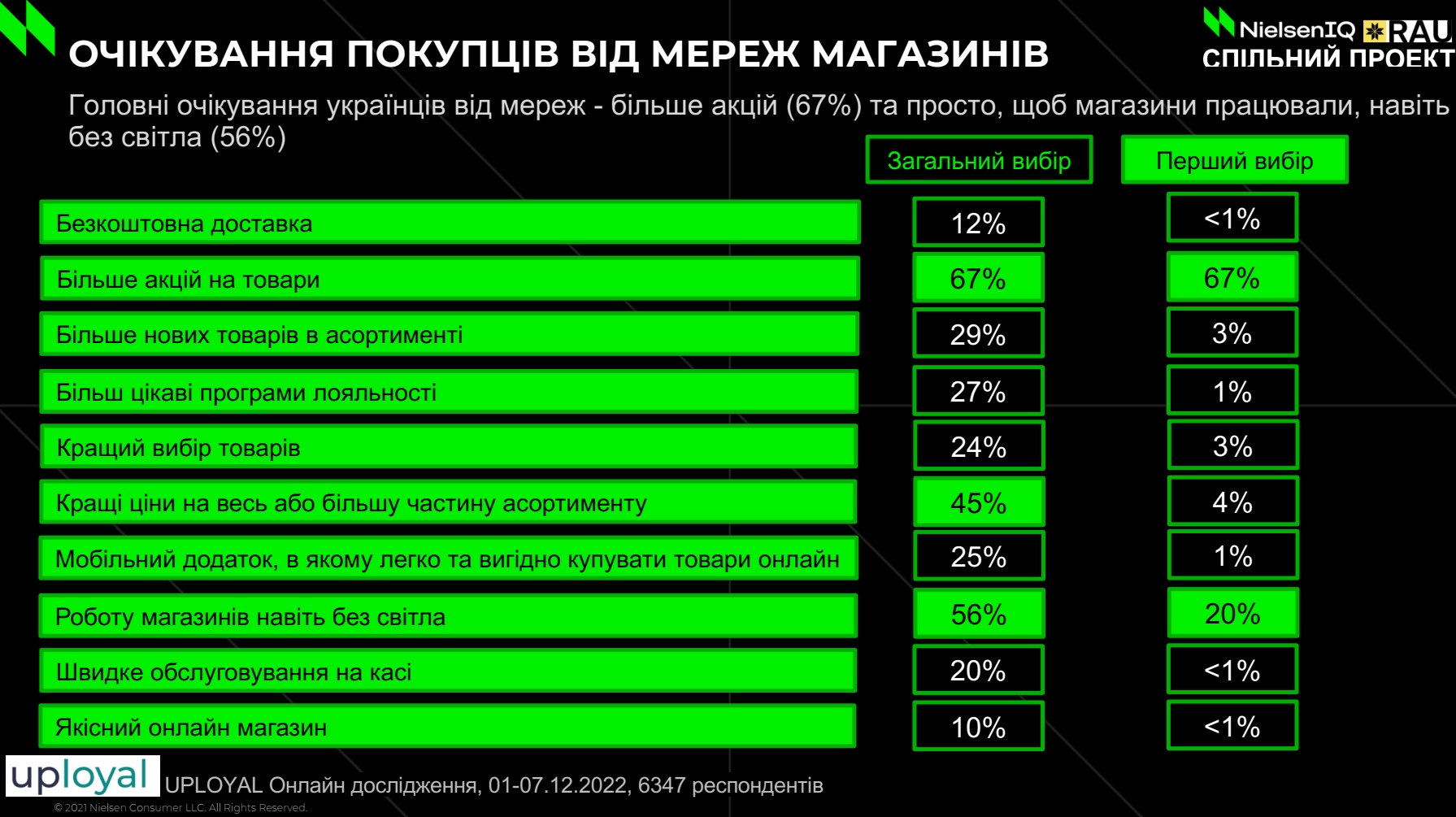 При этом для 56% потребителей важны не столько цены, сколько вообще сам факт работы магазина, пусть даже и без света. Для пятой части потребителей это самое главное. Также 67% украинцев хотят, чтобы сети больше проводили акционные продажи товаров и здесь они показывают неслыханное единодушие, потому что так же 67% сделали это своим первым выбором.