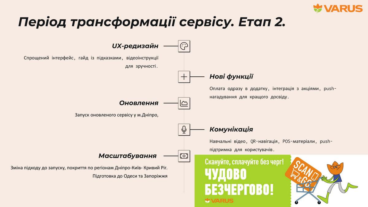 Понимая проблему очередей, сеть Varus запустила пилотный проект Scan&Go в октябре 2022-го в пяти магазинах в Днепре. Технология позволяет покупателям сканировать товары собственным смартфоном во время передвижения по торговому залу и оплачивать покупки на кассах самообслуживания, полностью минуя традиционные очереди. Что, кроме повышения удобства покупок, помогает уменьшить количество кассиров – важный аргумент в условиях дефицита кадров. Но перед использованием необходимо было сначала провести анализ рынка и готовности потребителей воспользоваться новым сервисом. Поэтому после изучения опыта других ритейлеров был создан прототип и проведено его внутреннее тестирование. И только потом – тестирование сервиса с наиболее продвинутыми клиентами Varus. Таких набрали ровно 1000 человек, максимально активных по цифровой карте лояльности в приложении ритейлера.