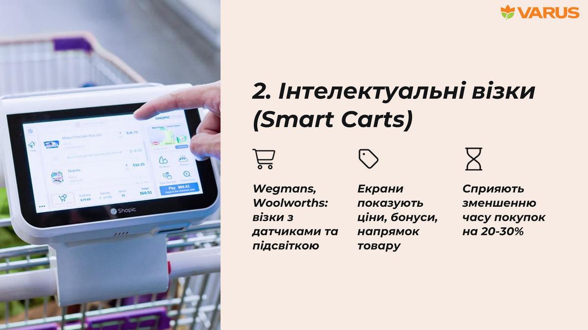 Еще одной разновидностью этой системы являются интеллектуальные тележки (Smart Carts, используемые вместо смартфонов для сканирования товаров). Как показал опыт ритейлеров Wegmans и Woolworths, система может сократить время покупок на 20-30%.
