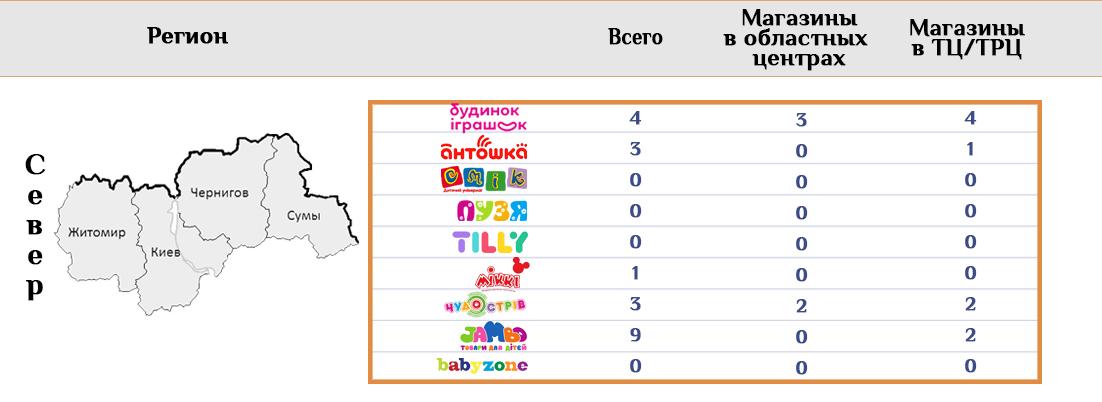 В самом богатом и потому привлекательном для ритейлеров регионе работают 7 из 9 торговых сетей. Будинок Іграшок здесь играет главную роль, значительно опередив конкурентов по числу торговых точек. На втором месте международная сеть СМІК, которая сумела открыть в столице на один магазин больше, чем другой крупнейший национальный ритейлер Антошка.