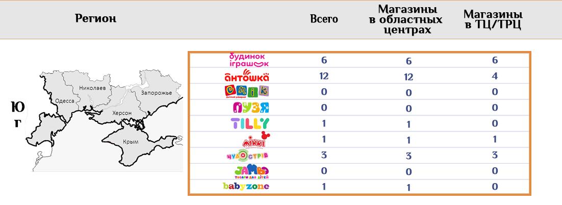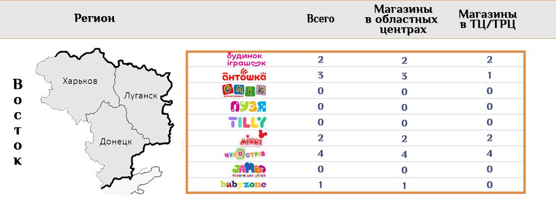 Хорошо заметно, что в отличие, например, от продавцов техники, торговцы детскими товарами не стараются работать исключительно в ТРЦ, независимо от тактики, используемой в других регионах. Так поступают только небольшие сети, у которых ТРЦ в приоритете. Например, МІККІ, Чудо остров и Babyzone.