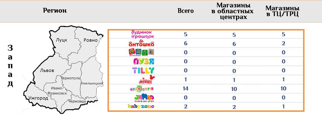 Здесь по количеству магазинов Антошка обогнал Будинок Іграшок, однако лидером региона является Чудо остров – целых четыре торговых точки. Впрочем, по процентному отношению к общему числу магазинов сети в лидерах МІККІ с его 14% точек.