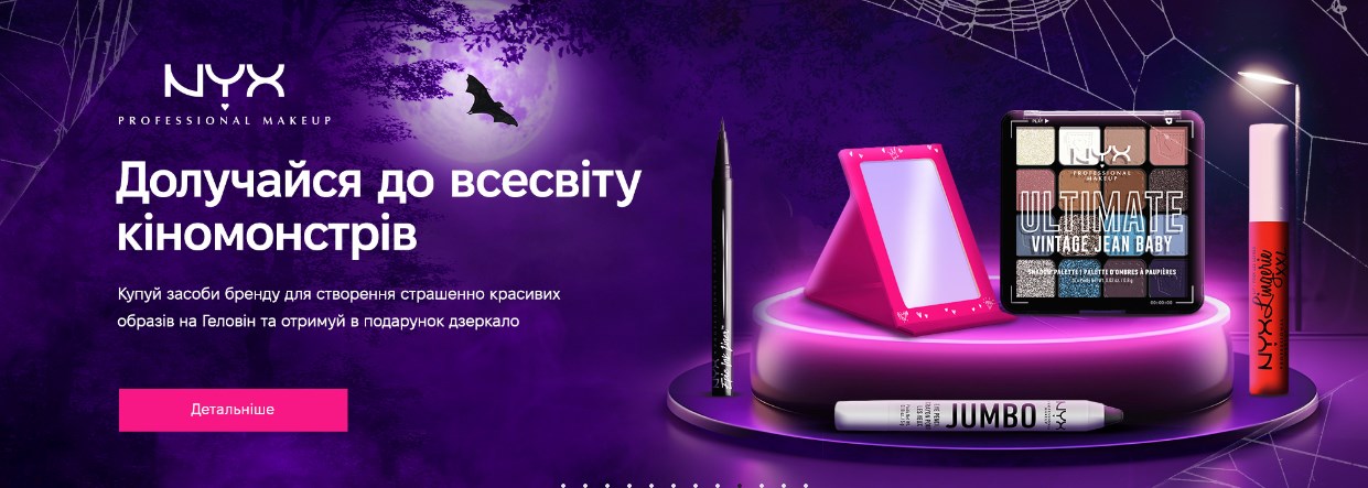 Makeup дарит скидку -25% на декоративную косметику бренда NYX, дает в подарок раскладное зеркало и предлагает сразу четыре жуткие макияжа с пошаговой инструкцией.